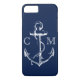 This phone case features a classic navy blue background with a nautical white anchor that has a sketchy feel and monogrammed initials.