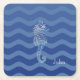 Nautical Navy Blue Stripe Waves Seahorse Square Paper Coaster