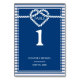 Modern nautical wedding table number featuring a whimsically romantic white heart knot displayed inside a navy blue border with rope accents and stripes. White typography. Classic navy blue and white colour scheme. Change the number for each one you need and order separately...1,2,3,10,20.