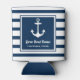Nautical can cooler design features a simple, stylish navy blue and white coastal style design with boat anchor accent. Personalise the custom text with the name of your boat along with her location city and state.