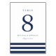 Simple and chic table number cards in classic navy blue, soft grey and crisp white feature a trio of nautical inspired stripes along the bottom. Personalise with your names and wedding date. Design repeats on reverse side. Coordinates with our Nautical Mix wedding invitation suite.