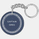 Personalise this classic nautical navy & white keychain with your boat name and ship's registry, set on a rope badge with an anchor illustration in the centre. Add the captain's name, or your custom message, to the back in white lettering on a navy blue background. Makes a great gift for new boat owners, houseboat dwellers, or captains!