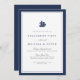 Our elegant boat themed engagement party invitations feature classic nautical styling with a clean, minimalist look. Design features a double border of rich navy blue with a navy tall ship illustration at the top. Elegant block and script lettering in soft grey and matching navy blue completes the look. Perfect for nautical or summer engagement parties, especially when hosted on a boat or at a yacht club.