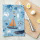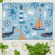 Ocean and nautical theme design features whales, orange sailboats, octopus, crabs, seahorses, ships wheels, anchors, lighthouses, and more on a pretty light blue background.