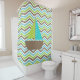 Nautical theme shower curtain in bright colours with chevron stripes of green, white, brown, and blue and a sailboat of brown with polka dotted sails of blue and green.