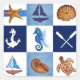 Original watercolor painted design by Sandra Gale, featuring blocks of nautical themed drawings like star fish, anchor, ship, turtle, and shells. Great design for the summer, beach homes, bungalows or for anyone who loves the beach, ocean or fish.