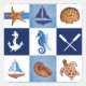Original watercolor painted design by Sandra Gale, featuring blocks of nautical themed drawings like star fish, anchor, ship, turtle, and shells. Great design for the summer, beach homes, bungalows or for anyone who loves the beach, ocean or fish.