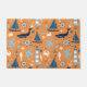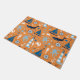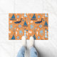 Nautical design doormat features a bright orange background with blue sailboats, crabs, octopus, ship wheels, whales, lighthouses, starfish, and anchors!