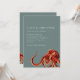 Modern nautical wedding Invitation for sea life lovers featuring a rich watercolor illustration of a rust octopus on a dusty teal background. Personalise with your details in white serif font. Add your wedding QR code to the reverse.