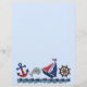Graphic illustration of nautical pattern of sailboat, ships wheel, anchor, and whale on the water.