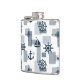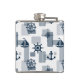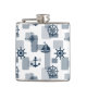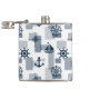 Seamless nautical themed design with sailing boat, compass, anchor and sailing wheel decoration on blue and white geometrical background