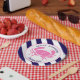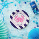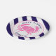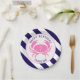 Birthday party plates featuring a nautical themed design with an illustration of a pink crab and a blue and white striped background. Personalise the text. Matching napkins, invitations, and more are available at Jill's Paperie.