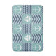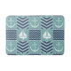 A quilt inspired pattern of stormy turquoise squares, decorated with a white sailboat and anchor, and deep navy blue squares, accented with paler blue chevrons and waves, is accented by white stitching to create a classic nautical feel.