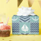 A quilt inspired pattern of stormy turquoise squares, decorated with a white sailboat and anchor, and deep navy blue squares, accented with paler blue chevrons and waves, is accented by white stitching to create a classic nautical feel.