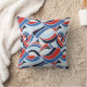 This throw pillow features an illustrated, abstract design that resembles ocean waves. The colours are shades of red, white and blue and the design is a flowing, repeating pattern. Perfect for beachy, coastal or nautical theme decor.