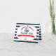 Nautical theme thank you note card with sailboat and life saver and navy and white stripe background with red accent colour.