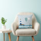 Throw cushion with digital nautical scene of a sailboat sailing in a wavy ocean and a hot air balloon floating passed a stripey lighthouse.