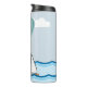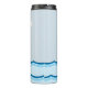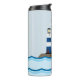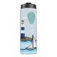 Thermal tumbler with nautical scene of a sailboat sailing in a wavy ocean with a hot air balloon above floating passed a lighthouse.