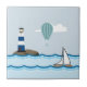 Ceramic tile with a nautical scene of a sailboat sailing in a wavy ocean with a hot air balloon above floating passed a lighthouse.