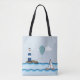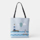 Tote bag with digital nautical scene of a sailboat sailing in a wavy ocean and a hot air balloon floating passed a stripey lighthouse.