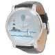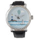 Watch with a nautical scene of a sailboat sailing in a wavy ocean with a hot air balloon above floating passed a lighthouse.