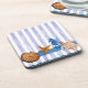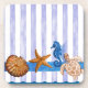 Original watercolor painted design by Sandra Gale, featuring star fish, sea horse, turtle and shells on a background of vertical translucent blue stripes. Great design for the summer, beach homes, bungalows or for anyone who loves the beach, ocean or fish.