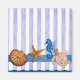 Original watercolor painted design by Sandra Gale, featuring star fish, sea horse, turtle and shells on a background of vertical translucent blue stripes. Great design for the summer, beach homes, bungalows or for anyone who loves the beach, ocean or fish.