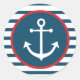 These nautical stickers features a hand dawn white ship anchor inside of a navy blue circle with a red frame highlighted against a navy blue and white stripe background.