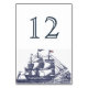 Blue and white nautical themed wedding reception table number card done in a white, with blue vintage artwork of an old time sailing ship flying the American flag. Personalise the blue number for each table at your reception. Matching products are available.