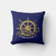 Nautical Ship Wheel Welcome Aboard Navy Blue Gold Cushion
