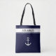 Nautical silver grey anchor & text on navy blue tote bag