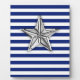 A silver chrome like star design on a navy blue stripes decor. A modern nautical gift.