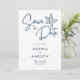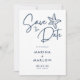 Nautical save the date card features navy blue handwriting script and a starfish illustration on a white background. Reverse side is a hand drawn wave pattern. Perfect for coastal, beach and sea themes.