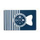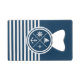 Nautical themed design with nautical symbols (anchor, sailing boat, sailing wheel, compass) decoration on white and navy blue striped background.