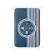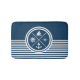 Nautical themed design with nautical symbols (anchor, sailing boat, sailing wheel, compass) decoration on white and navy blue striped background.