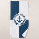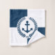 Nautical themed design with anchor and laurel wreath decoration over blue and white geometric background