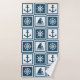 Nautical themed design with sailing wheel, sailing boat,compass and anchor decoration in white and blue striped squares