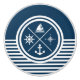Nautical themed design with nautical symbols (anchor, sailing boat, sailing wheel, compass) decoration on white and navy blue striped background.