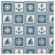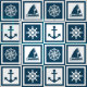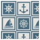 Nautical themed design with sailing wheel, sailing boat,compass and anchor decoration in white and blue striped squares