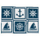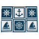 Nautical themed design with sailing wheel, sailing boat,compass and anchor decoration in white and blue striped squares