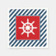 Nautical themed design with sailing wheel decoration in square on blue and white striped background