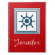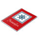 Nautical themed design with sailing wheel decoration in striped squares on red background
