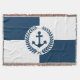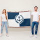 Nautical themed design with anchor and laurel wreath decoration over blue and white geometric background