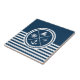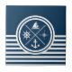 Nautical themed design with nautical symbols (anchor, sailing boat, sailing wheel, compass) decoration on white and navy blue striped background.