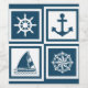 Nautical themed design with sailing wheel, sailing boat,compass and anchor decoration in white and blue striped squares
