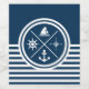 Nautical themed design with nautical symbols (anchor, sailing boat, sailing wheel, compass) decoration on white and navy blue striped background.