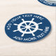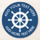 Navy blue and white nautical ship wheel paper coasters. Custom paper coasters in round or other shape. Maritime theme / beach party coasters with sailing boat helm. Trendy design for destination wedding, engagement, baby shower, bridal shower, anniversary etc. Round text template place in a circle around the logo. Personalizable throw away accessories and supplies.