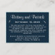 Nautical Navy Blue and White Wedding Accommodation/Reception Cards-- features a navy blue background with various elegant fonts at the top and white silhouettes of seagulls. Inform your guests of any special wedding information & nearby hotel accommodations to make their journeys to your big day simple. Simply slip these cards in with the matching invitations & RSVP cards. Reception cards feature a printed burlap design. Find matching products below on this page. Card stock is set to white; however, you can change the stock to cream, linen, metallic, eggshell shell under option 2). (below the personalise feature).