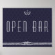 Nautical Open Bar wedding reception sign (poster) with white anchir and customisable white text, printed on navy blue background and anchor pattern. Dimensions of the sign print (poster) are 14 inches by 11 inches.