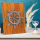 A nautical wheel design on a teak wood veneer grain style background decor. A racy modern nautical gift.